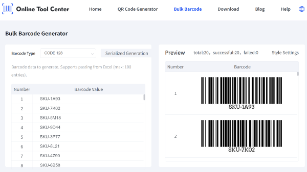 Масове генерування штрих-кодів онлайн безкоштовно. Створіть код 128, UPC, EAN, код 39 та QR-коди за кілька секунд. Ідеально підходить для роздрібної торгівлі, складів та команд електронної комерції.